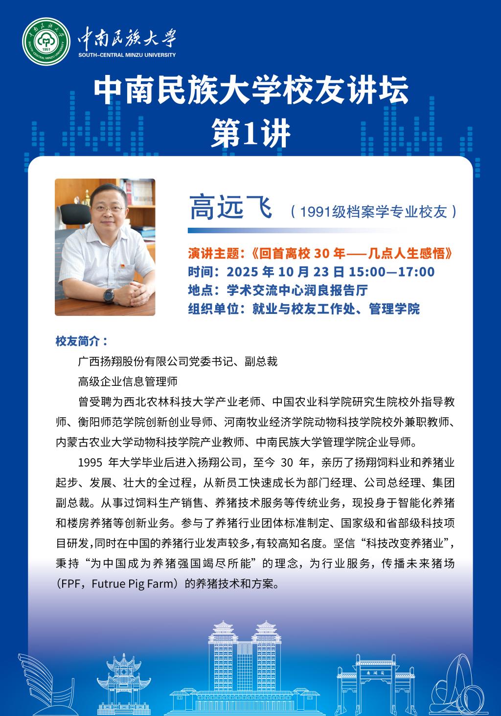 广西扬翔股份有限公司党委书记、副总裁,高级企业信息管理师,我校1991级档案学专业校友。曾受聘为西北农林科技大学产业导师、中国农业科学院研究生院校外指导教师、衡阳师范学院创新创业导师、河南牧业经济学院动物科技学院校外兼职教师、内蒙古农业大学动物科技学院产业教师、我校管理学院企业导师。1995年大学毕业后进入扬翔公司,至今30年,亲历了扬翔饲料业和养猪业起步、发展、壮大的全过程,从新员工快速成长为部门经理、公司总经理、集团副总裁。