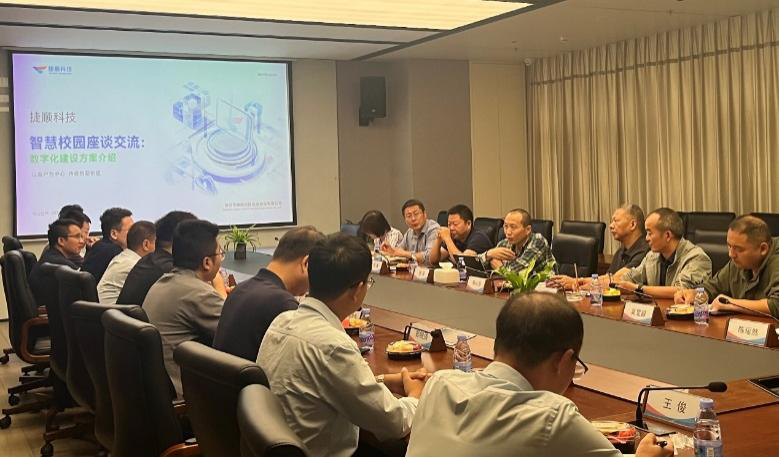 参观结束后,双方举行座谈交流。捷顺科技副总经理何军对调研组表示欢迎,提出近期将在学校组织专场招聘,并希望共建联合实验室,推动校企合作向技术研发与人才共育纵深发展。企业相关负责人围绕企业数字化转型实践与智慧校园解决方案作专题分享,系统介绍了以“统一PaaS平台+数据中台”为基座的架构设计,并针对校园安全、智慧治理、低碳发展等核心需求,重点解读了安全管控、智慧运营与绿色节能等方面的场景化解决方案。