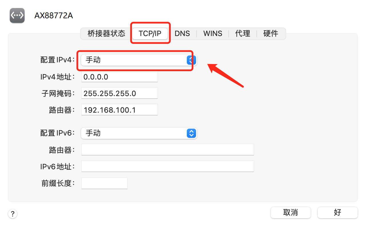 4.在TCP/IP栏里,将配置IPv4选项更改为"手动"并配置IP地址信息。