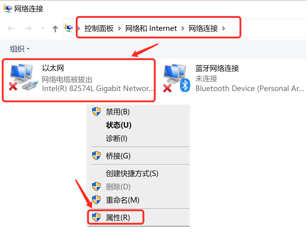 3.右击“以太网”,在弹出菜单内选择“属性”。