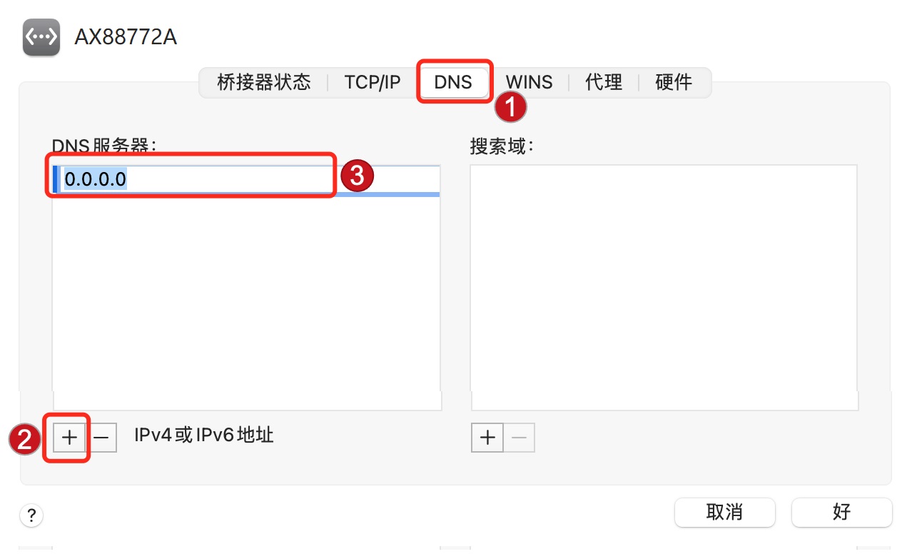5.配置DNS,在DNS选项卡内,点击左侧的+号,输入您的DNS地址,输入完成,点击“好”。