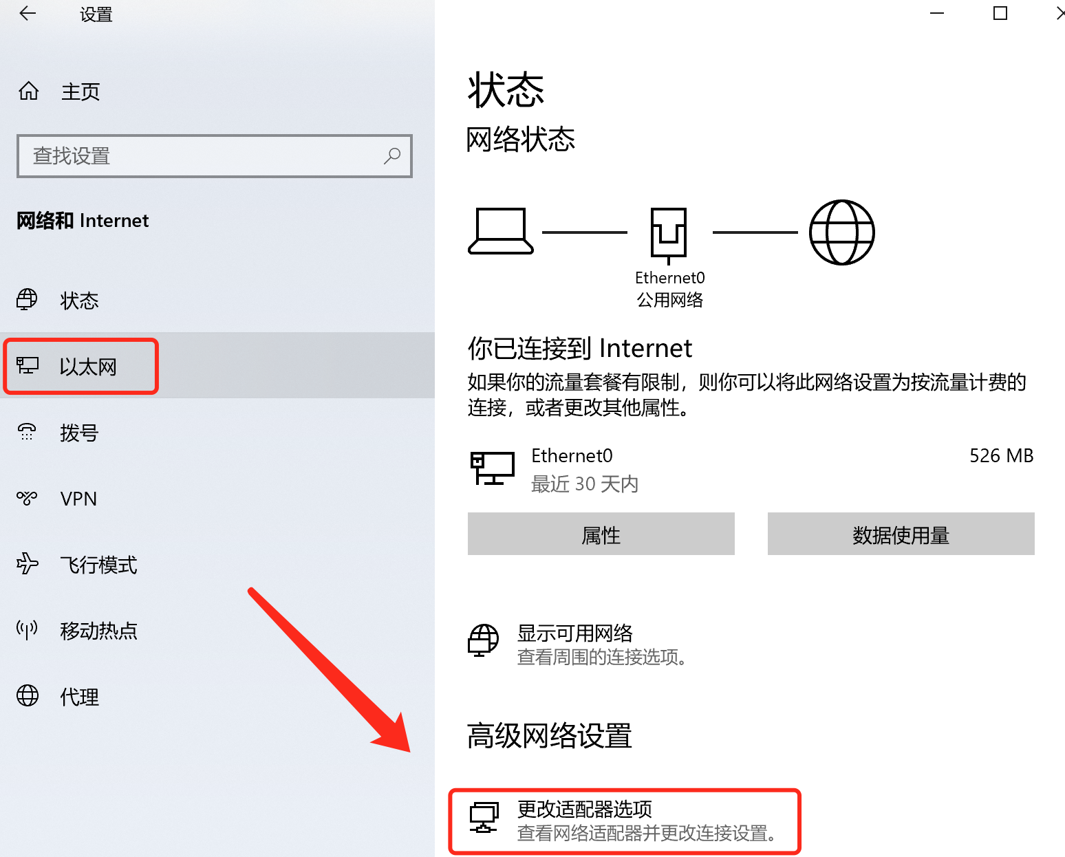 2.在左边菜单选择“以太网”,进入“更改适配器”。