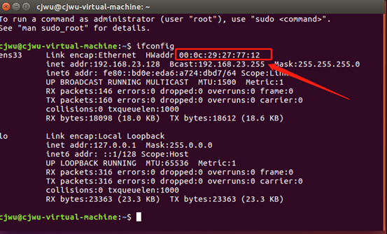 3.第一行中Hwaddr后面的字符就是MAC地址