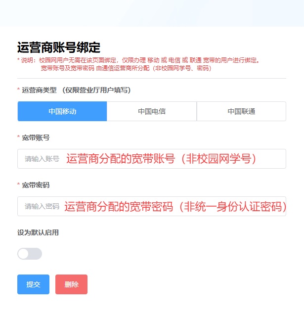 ·校园网用户:校园网账户已默认激活,只需充值即可按“第2步”操作直接上网(无需绑定“运营商账号”)。