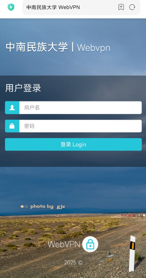 ·运营商用户:需移步至校内运营商营业点办理相关套餐(注册)。办理完成后,进入中南民族大学WebVPN系统(https://webvpn.scuec.edu.cn),用学号和统一身份认证系统密码登录(如图2所示)。