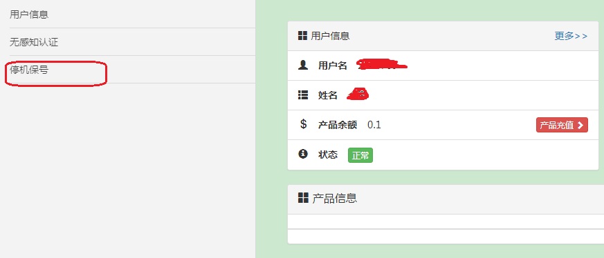 步骤3:点击左侧菜单栏“用户”选项卡,进入子菜单,点击“停机保号”选项卡,如下图所示。
