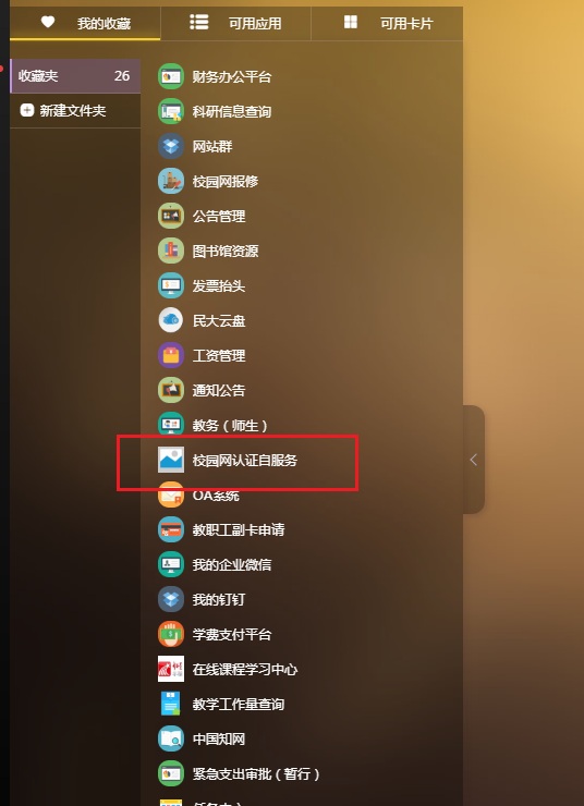 步骤1:通过“中南民族大学网上办事服务大厅(点击进入)”进入,查找“校园网认证自服务”应用,点击进入;或在浏览器直接输入http://selfservice.scuec.edu.cn进入校园网认证自服务认证界面,登录账号为学号、密码为网上办事服务大厅密码,如下图所示。