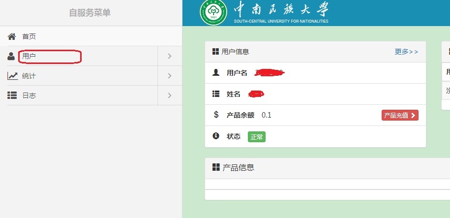步骤2:进入到“校园网认证自服务”首页,点击左侧菜单栏“用户”选项卡,如下图所示。