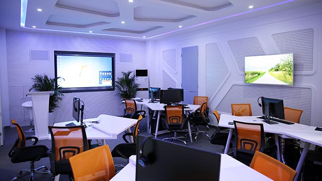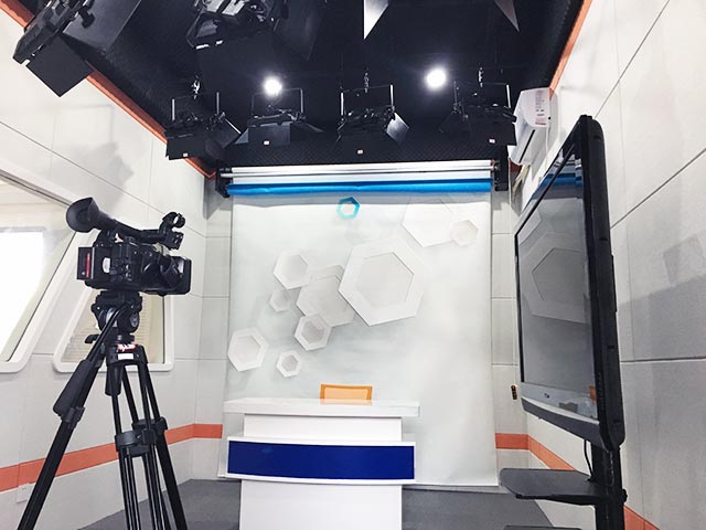 演播区:通过声学光学装修、专业摄像拾音设备及场景搭建,可满足出镜式教学资源专业录制需求,同时支持虚拟拍摄和实景拍摄。