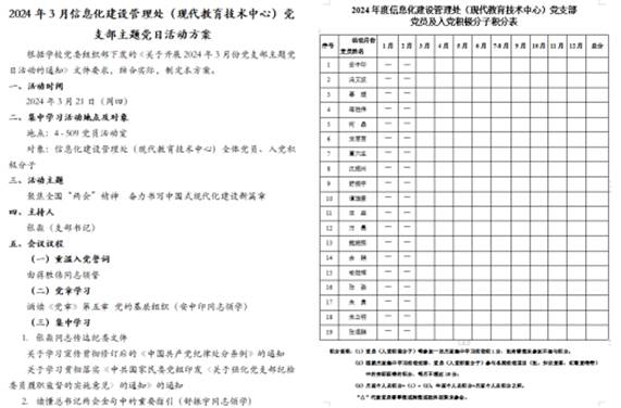 信息处党支部3月主题党日活动方案及党员积分表。余鹏供图