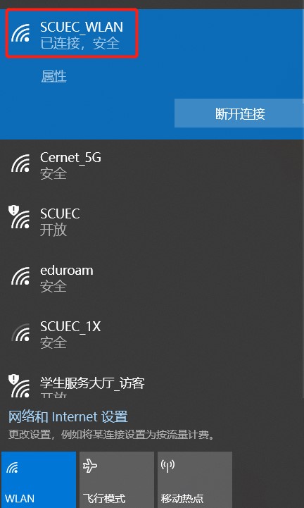 目前SCUEC_WLAN支持所有主流终端和操作系统,下面列出 Windows10系统的配置方法。
