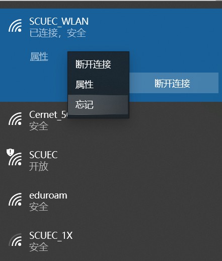 (1)如果您之前连过SCUEC_WLAN,或配置不成功的,请先忘记此网络;